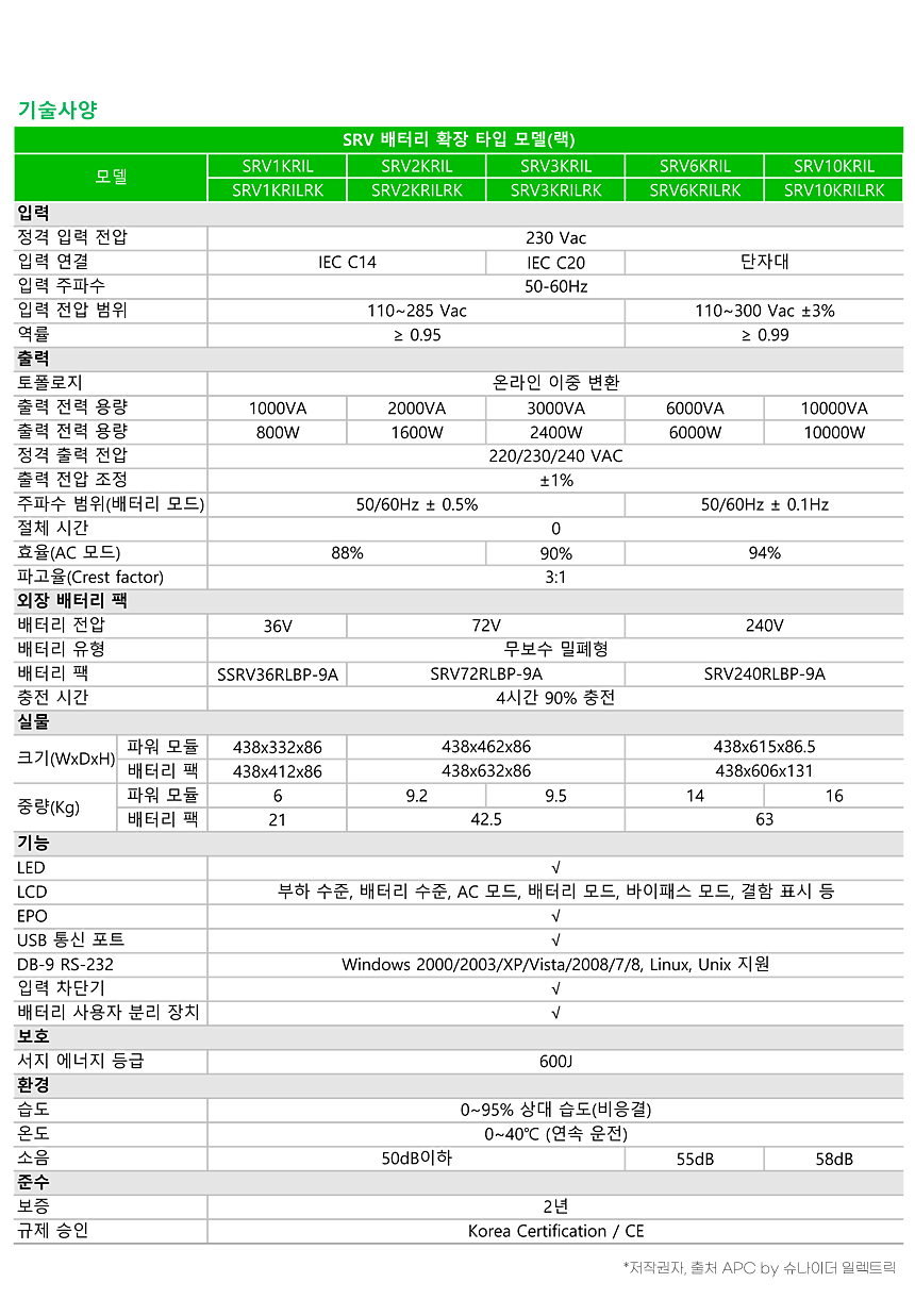 SRV1KRILRK EASY-UPS 1kVA 1000VA 800W 230V 확장 런타임 모델 랙타입
