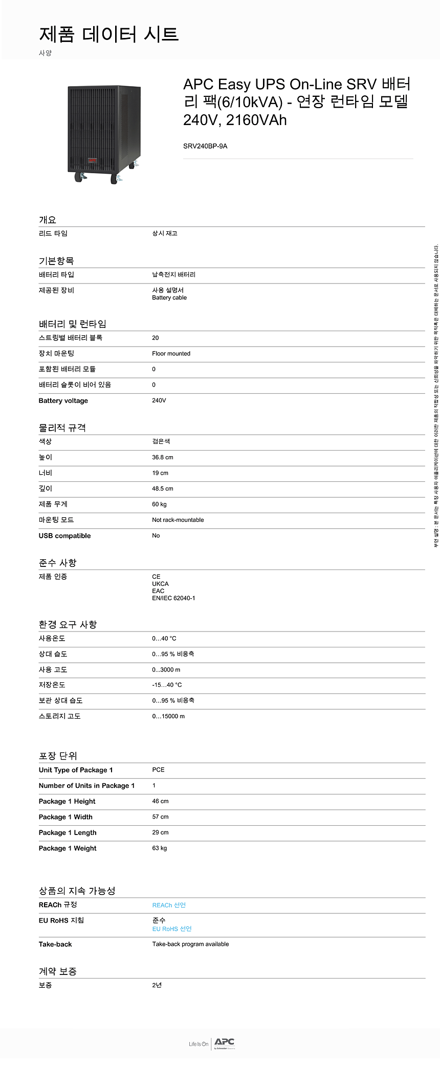 SRV240BP-9A Easy-UPS 240V Battery Pack 타워타입 (SRV6KIL/10KIL용)