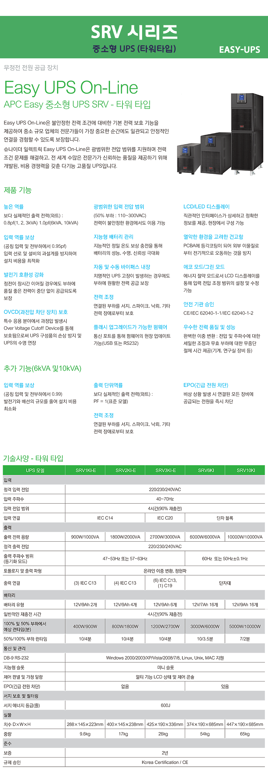 SRV2KI-E EASY-UPS SRV 2kVA 2000VA 1800W 230V 타워타입 무정전전원장치
