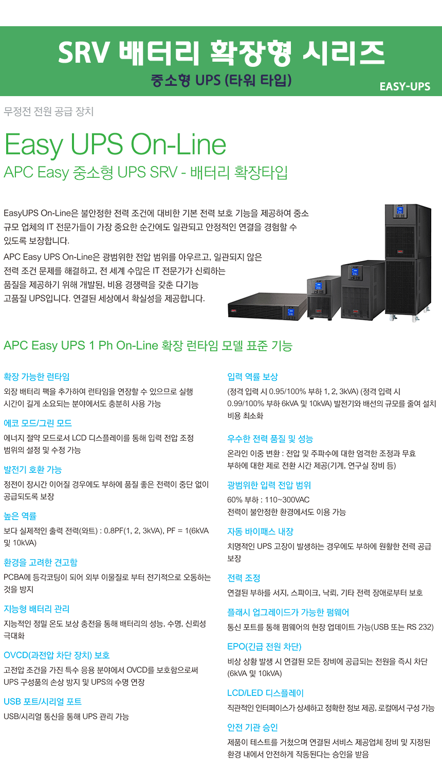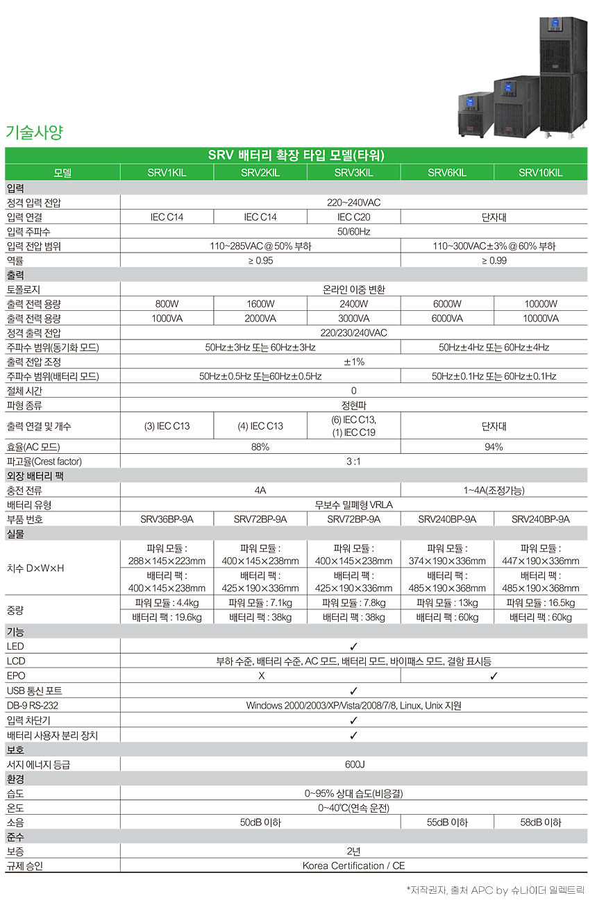 SRV3KIL EASY-UPS 3kVA 3000VA 2400W 230V 확장 런타임 모델 타워타입