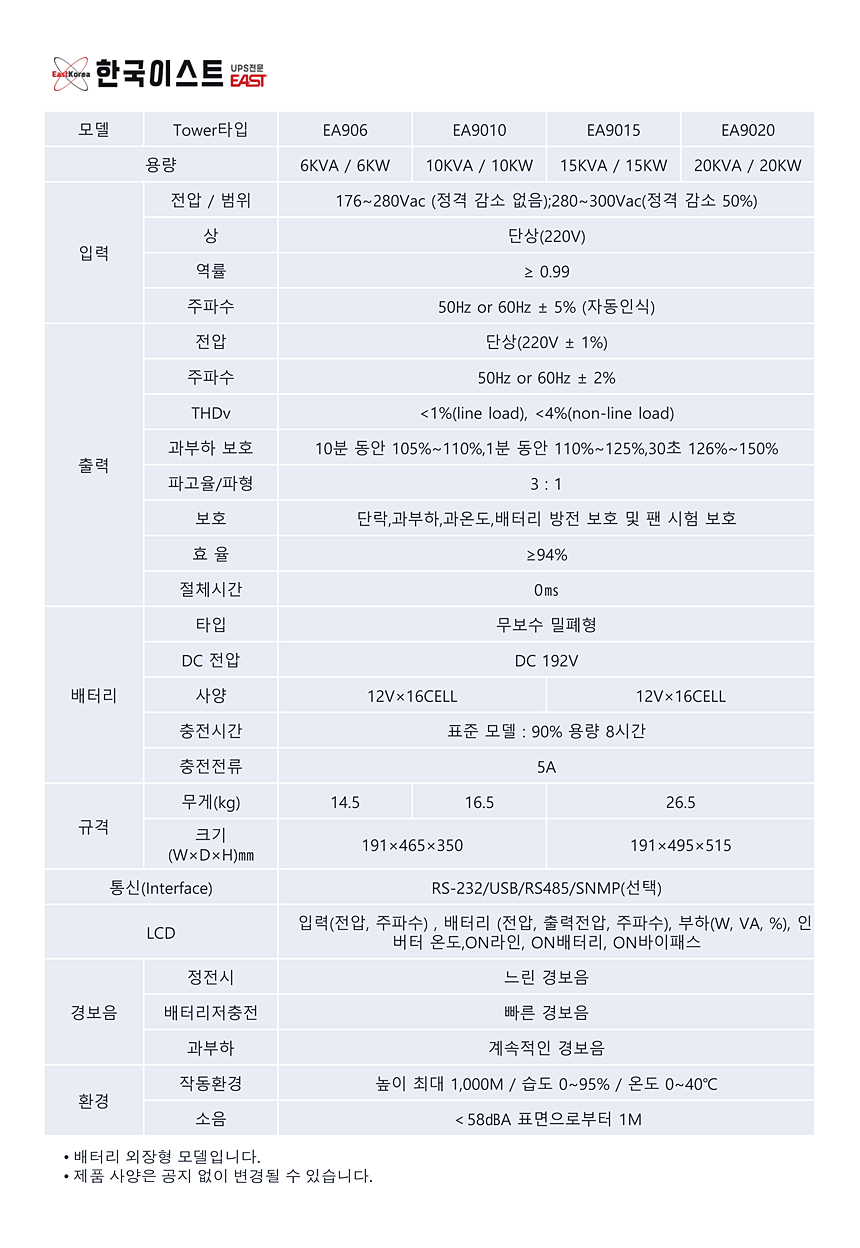 EA906 외장형배터리포함 6KVA 6KW PF 1.0 UPS 고효율 AVR 무정전전원공급장치 타워형