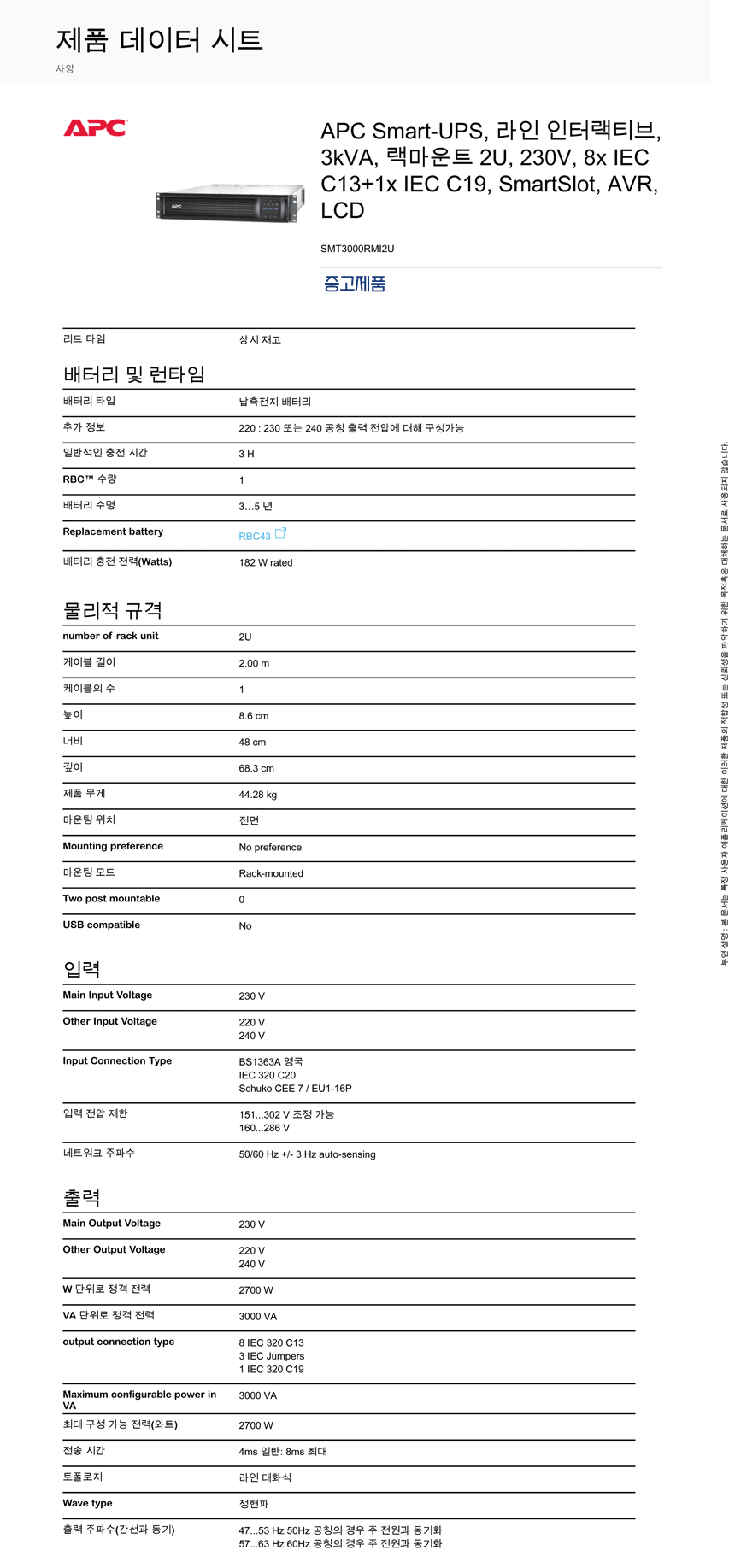 [중고UPS] APC SMT3000RMI2U 랙타입 3000VA 270W 무정전전원공급장치