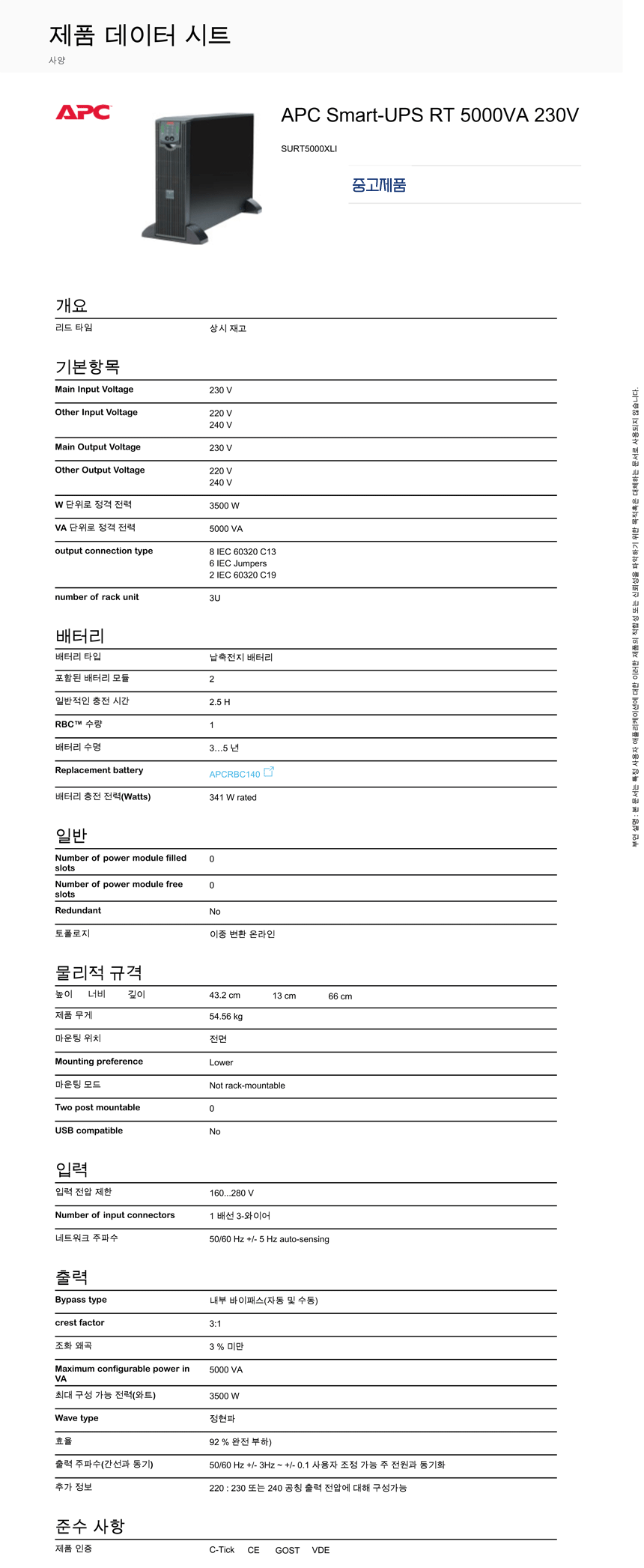 [중고UPS] APC SURT5000XLI 타워/랙타입 5KVA 3.5KW 무정전전원공급장치